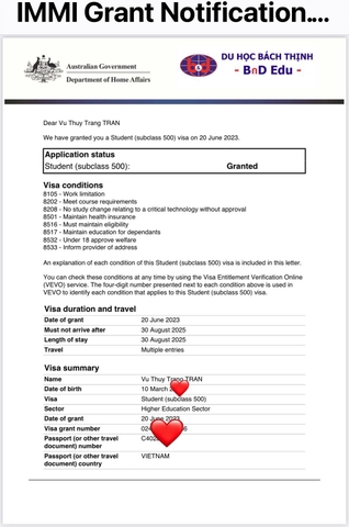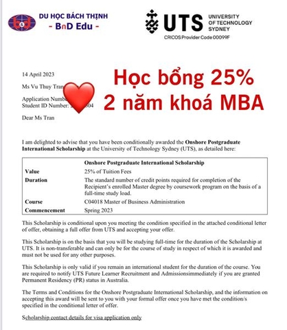 Chúc mừng Thuỳ Trang xuất sắc đạt học bổng 25% khoá học Thạc sỹ MBA 2 năm tại Đại học danh tiếng của Úc - University of Technology Sydney - UTS và được cấp #Visa_du_học_Úc