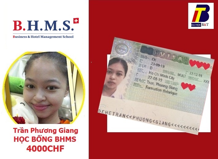 Du học B&T chúc mừng bạn Trần Phương Giang đã xuất sắc dành Học bổng 4.000 CHF từ trường Quản trị Khách sạn BHMS Thụy Sĩ và nhận Visa du học tại BHMS Thụy Sĩ - khóa Cử nhân Quản trị Khách sạn Quốc tế.