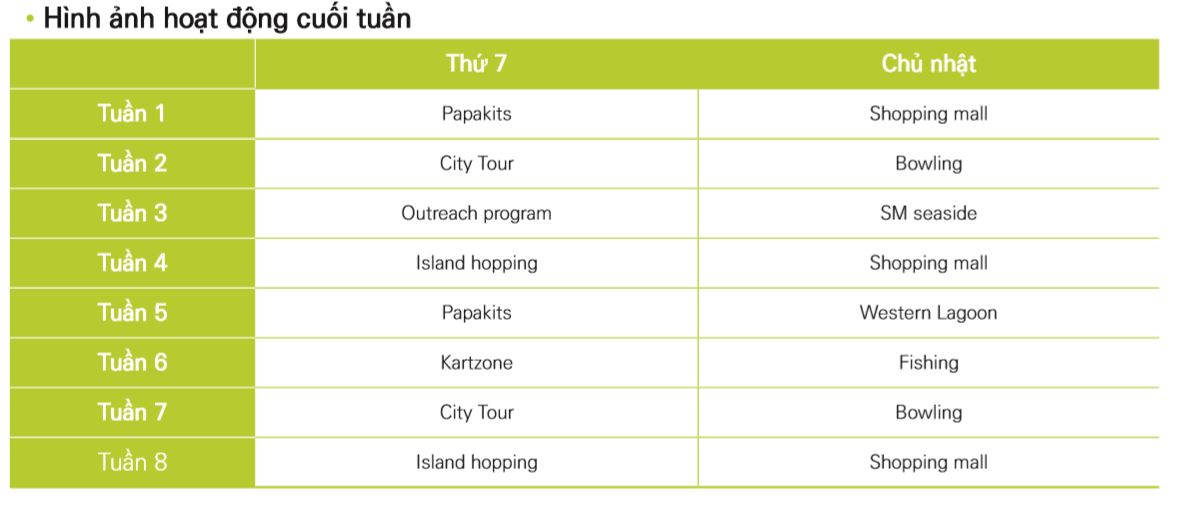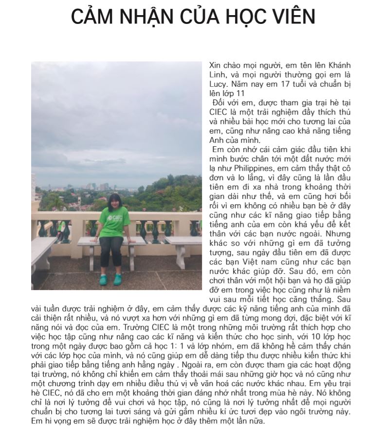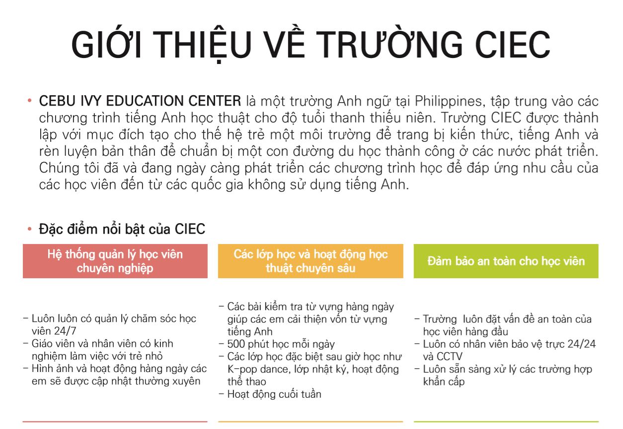 Trường tổ chức chương trình trại hè cho các bạn tại khuôn viên trường CIEC - Tọa lạc tại khu Talamban, Cebu, Philippines. Trường gồm 2 ký túc xá Center và Townhouse, được bảo vệ canh gác 24/24 cùng với nhiều camera an ninh được bố trí khắp nơi để đảm bảo an toàn cho bạn trong thời gian học tập và sinh hoạt.