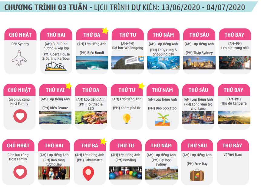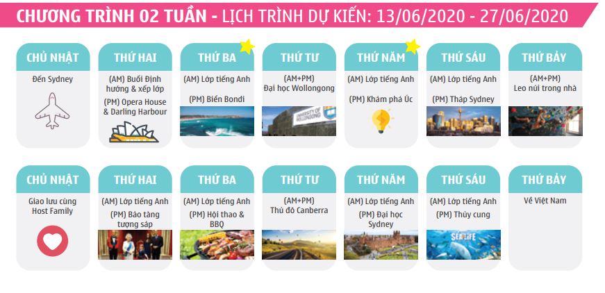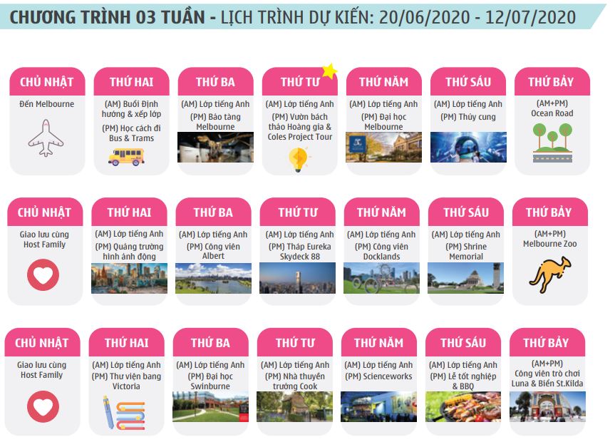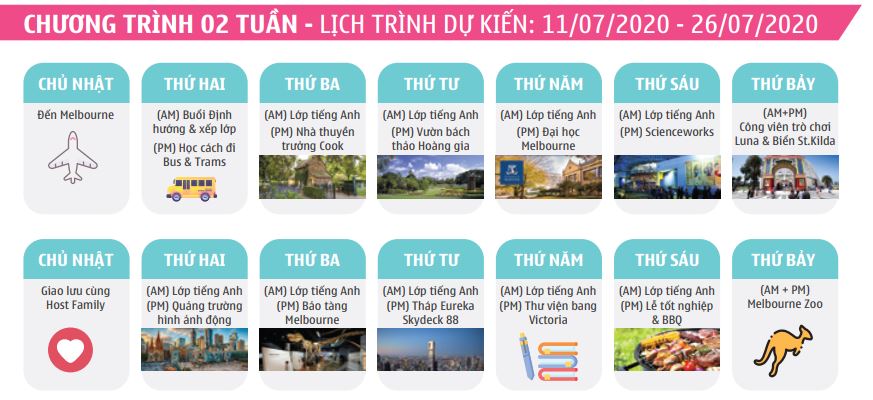 Để đáp ứng mọi nhu cầu và điều kiện của các em học sinh và quý vị phụ huynh, Du học hè Úc 2020 Sydney - Melbourne đã mở rộng thêm lịch trình mới với thêm nhiều lựa chọn hơn cho các bạn nhỏ. Ngoài lịch trình 2 tuần, giờ đây còn có thêm lựa chọn lịch trình 3 tuần với thật nhiều điểm vui chơi, khám phá và học tập bổ ích được bổ sung để các bạn học sinh có thêm thật nhiều thời gian trải nghiệm tại xứ sở của những chú chuột túi.