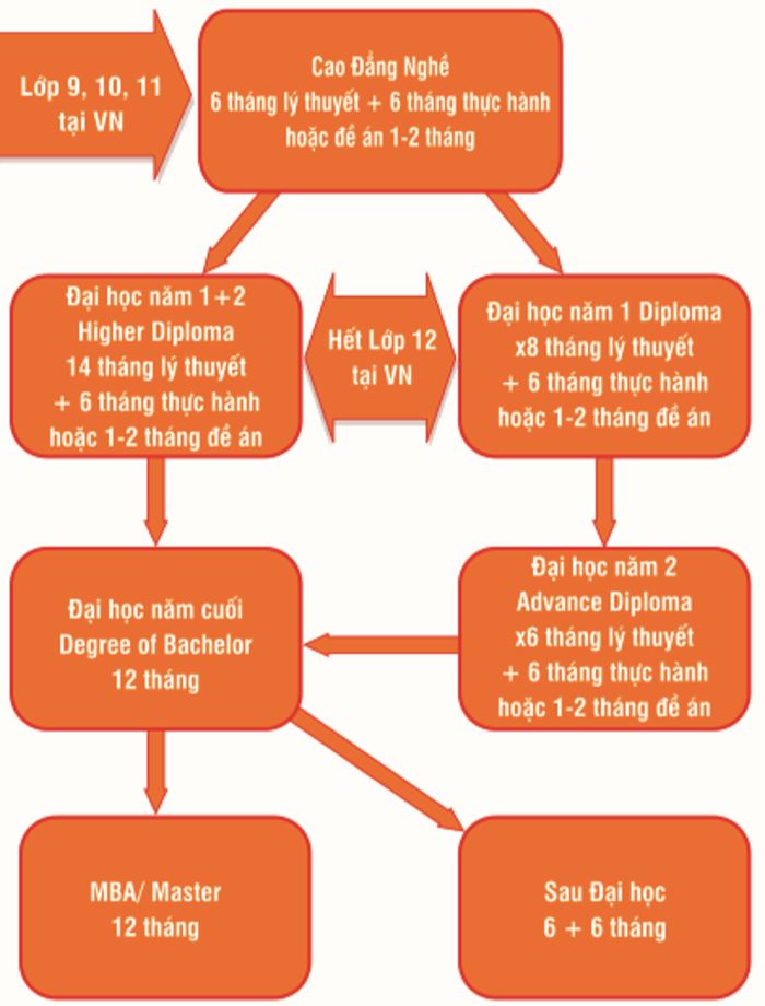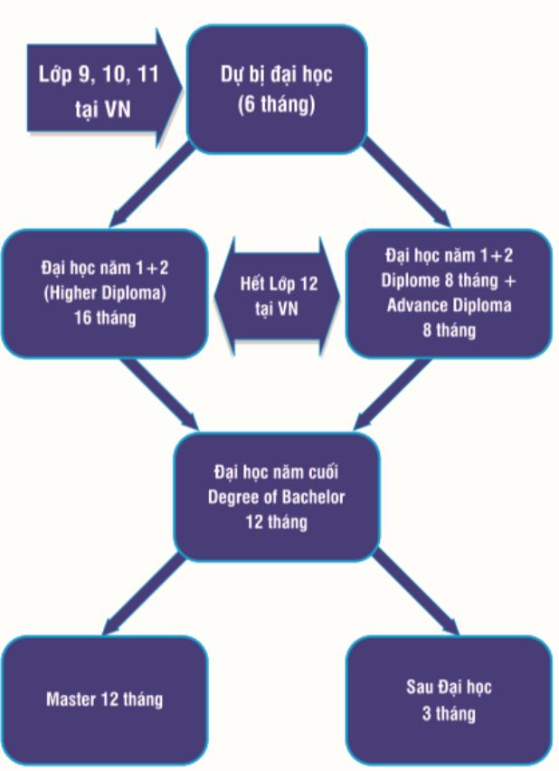 b1. Diploma (8 tháng lý thuyết + 6 tháng thực tập) + Advance Diploma (6tháng lý thuyết + 6 tháng thực tập, hs chọn thực tập 1 lần trong suốt quá trình học nên chọn thực tập năm 1 or 2 còn ko thực tập làm đề án 1-2 tháng),( bằng do Dimensions cấp) + Degree 12 tháng ( bằng do Cardiff Met UK cấp).