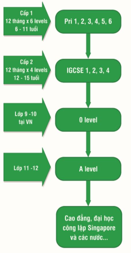 - Cấp 1 quốc tế từ 1-6 levels học 12 tháng 1 level, học chương trình này hs vẫn có thể đăng ký tham gia thi vào công lập cấp 1. Ko có lớp ôn công lập 2 môn văn toán cho cấp 1. Nhận hs từ 6-11 tuổi. Học phí sau khuyến học 14,670.77 SGD