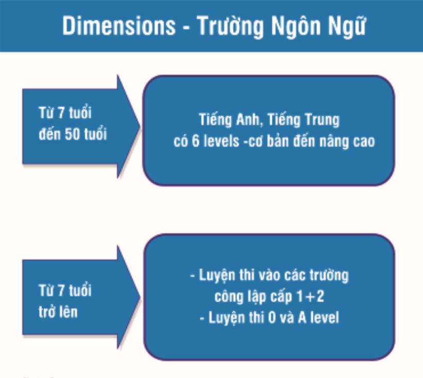 Dimensions cung cấp chương trình tiếng Anh với các cấp độ từ cơ bản đến nâng cao. Học sinh sẽ học trong 3 tháng hoặc 6 tháng tùy vào đầu vào của mỗi bạn. Học phí sau học bổng của khóa 3 tháng là 5,756.60 SGD hoặc 7,678.32 SGD đối với khóa 6 tháng.