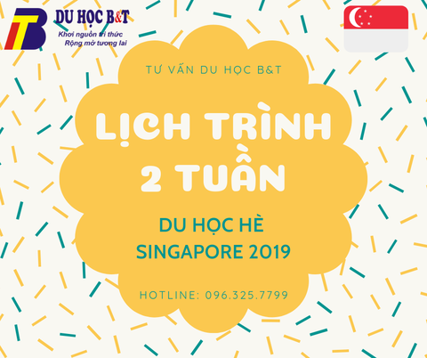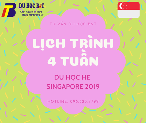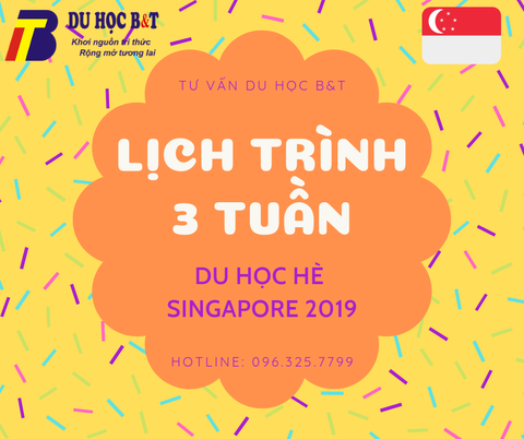 DU HỌC HÈ SINGAPORE 2019 LỊCH TRÌNH 3 TUẦN Tư vấn du học B&T trân trọng gửi tới quý vị phụ huynh và các bạn học sinh lịch trình 3 tuần du học hè Singapore năm 2019. Hiện có tất cả 8 lịch trình A, B, C, D, E, F, G, H để phù hợp với tất cả nhu cầu về thời gian của các bạn nhỏ. - Lịch trình A: Từ ngày 26/05/2019 đến 15/06/2019 - Lịch trình B: Từ ngày 02/06/2019 đến 22/06/2019 - Lịch trình C: Từ ngày 09/06/2019 đến 29/06/2019 - Lịch trình D: Từ ngày 16/06/2019 đến 06/07/2019 - Lịch trình E: Từ ngày 23/06/2019 đến 13/07/2019 - Lịch trình F: Từ ngày 30/06/2019...