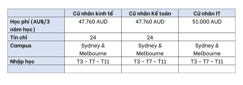 - Học bổng tự động: Dành cho sinh viên có quốc tịch Việt Nam – Giảm AU$ 7.200 cho tổng học phí khóa học Cử nhân 3 năm