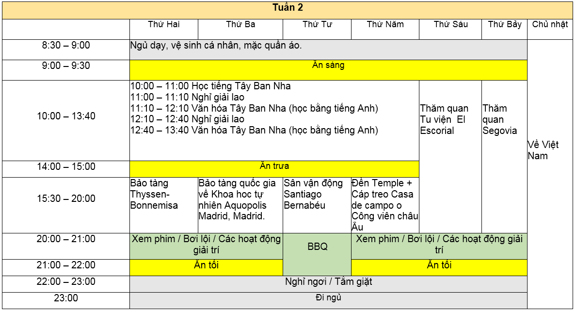 Bảng bên dưới là toàn bộ thông tin để tiện cho việc tham khảo và theo dõi theo dõi lịch trình của con em mình tại Tây Ban Nha dành cho các phụ huynh