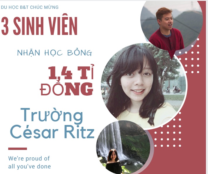 Du học B&T xin CHÚC MỪNG 3 bạn sinh viên Quỳnh Anh, Quỳnh Chi và Bảo Hiếu đã dành được 3 SUẤT HỌC BỔNG TRỊ GIÁ 1.4 TỈ ĐỒNG cho toàn bộ 3 năm học tại ĐH QUẢN TRỊ KHÁCH SẠN CÉSAR RITZ- THỤY SĨ kỳ khai giảng tháng 7/2018.