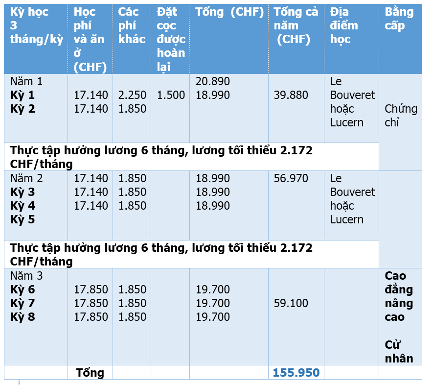 - 4-6 tháng thực tập hưởng lương tại Thụy Sĩ hoặc các nước. Mức lương tối thiểu ở Thụy Sĩ là 2,172-2.450 CHF /tháng