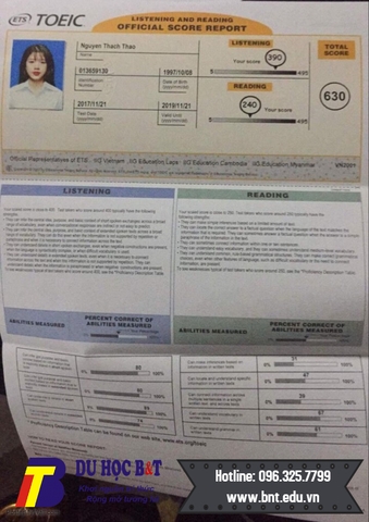 Bạn Nguyễn Thạch Thảo khi kết thúc khóa học đã xuất sắc nâng điểm TOEIC của mình từ 450 lên 630 chỉ sau 8 tuần học ngắn ngủi tại Philippines. B&T xin chúc mừng bạn Thạch Thảo và chúc bạn sẽ hoàn thành được mục tiêu học tập của mình cũng như đạt được thật nhiều thành công trong sự nghiệp và cuộc sống sau này!