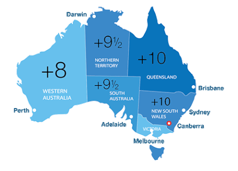 - Múi giờ: Do diện tích rộng lớn, Australia có 3 múi giờ khác nhau: UTC+8 tới +10.5. Việc chỉnh giờ theo mùa (daylight Saving) được thực hiện ở 1 số tiểu bang mùa hè UTC+9 tới +11.5.