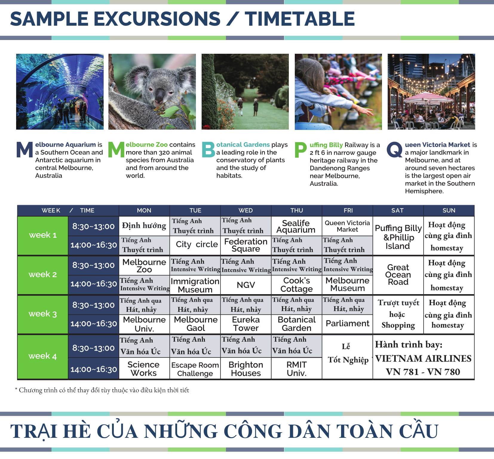 Mỗi ngày học sinh sẽ được khám phá các hoạt động khác nhau trong thành phố, các hoạt động này sẽ được hướng dẫn bởi giảng viên cùng nhân viên trợ lý trại hè, học sinh sẽ được khám phá các điểm tham quan và thử thách hoạt động nhóm thú vị nhất, mang đậm bản sắc văn hóa ở Melbourne.