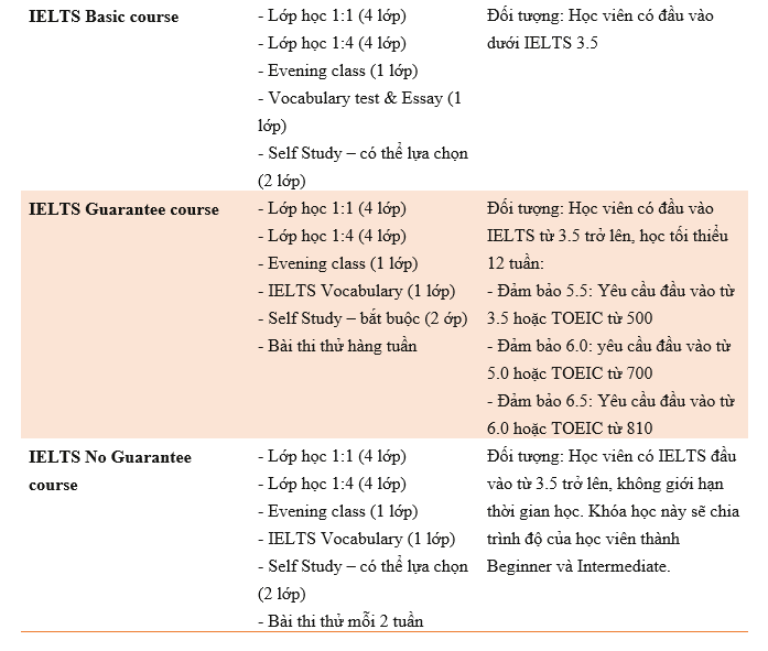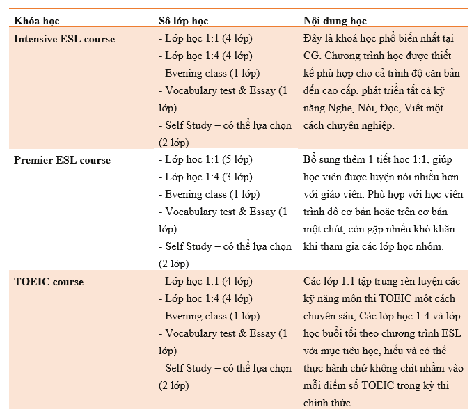 - Lớp học 1:1 học 4 lớp mỗi ngày thông qua Intensive ESL course.