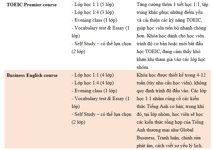 - Lớp học 1:1 học 5 lớp mỗi ngày thông qua Premier ESL course.