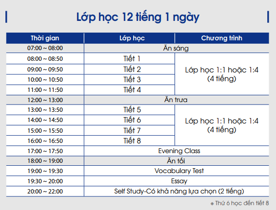 - Từ thứ 2 ~ thứ 5 (Thứ 6 học đến 5h chiều) từ 8 giờ sáng đến 10 giờ tối, cung cấp bài học với tiêu chuẩn cao và mang tính hệ thống không có giờ giảng trống bởi các giáo viên nhiều kinh nghiệm.