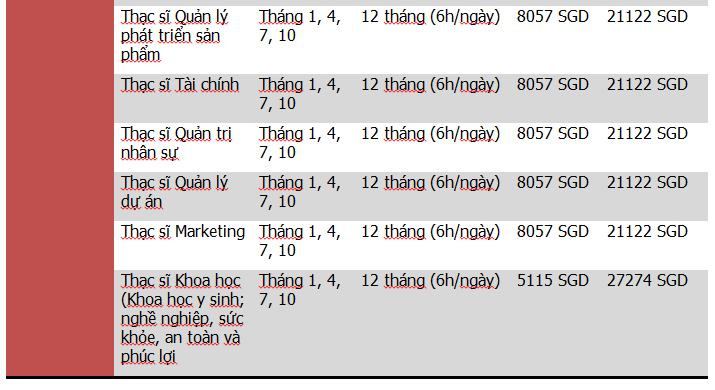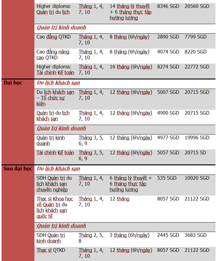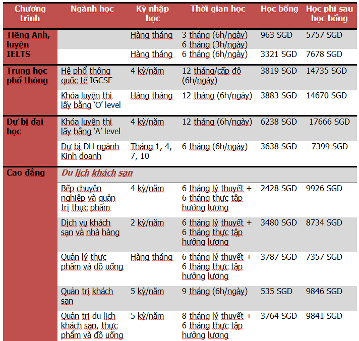 (Học phí năm 1, 2 dao động 7,600-10,000 SGD. Học phí đại học, thạc sỹ dao động 20,000-21,500SGD)