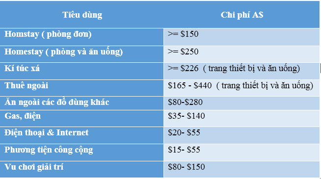 Ngoài học phí mỗi năm sinh viên quốc tế cần chi trả các chi phí sinh hoạt: ăn uống, phương tiện đi lại, vui chơi giải trí khoảng 19.830 $A/ năm